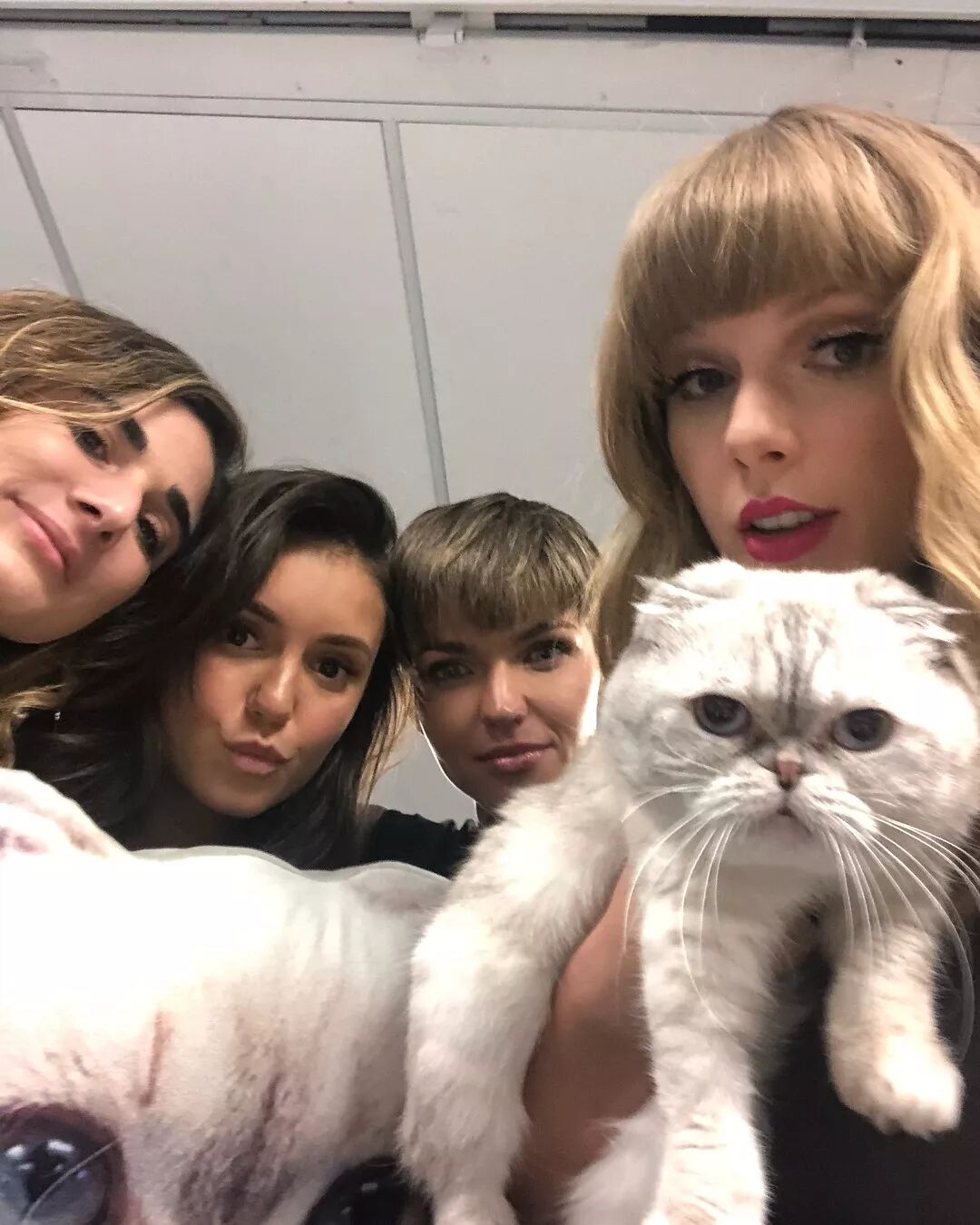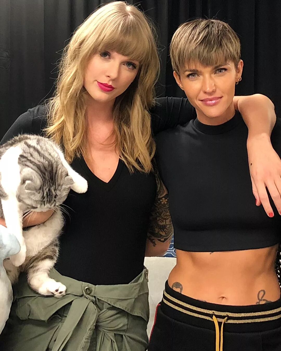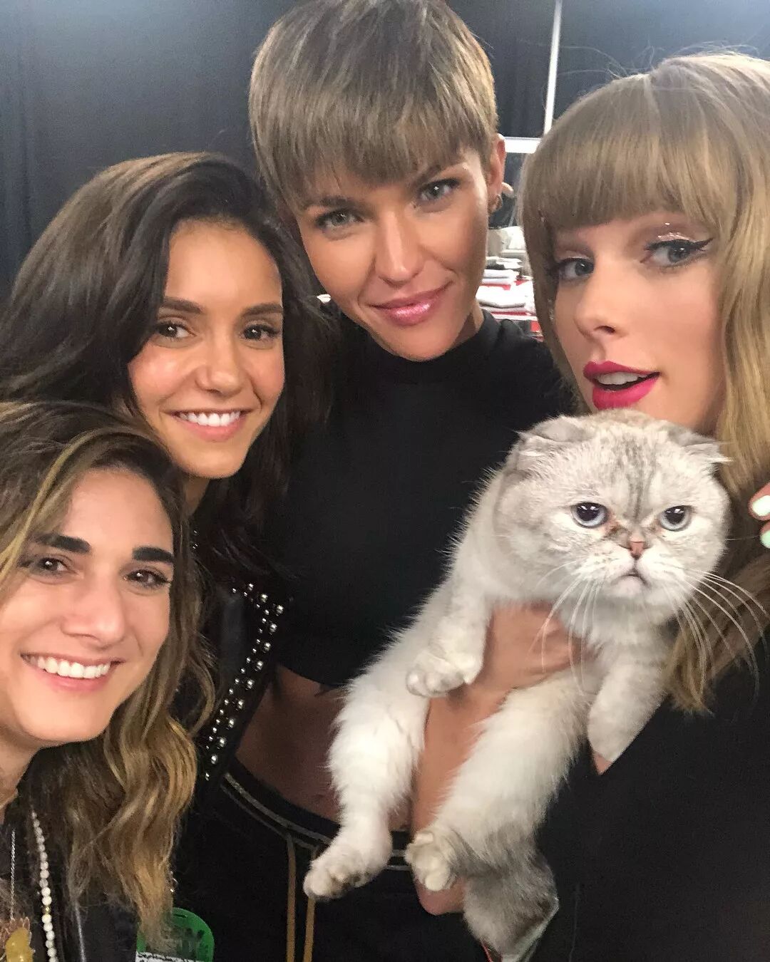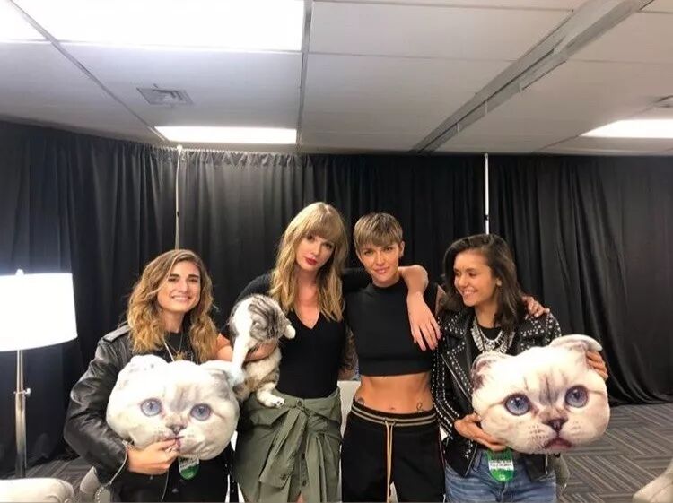 总之这不重要,重点在于Taylor当晚表演的很High,从上方的视频就可以看出来,不过Taylor这么High的原因,也许是因为当晚,许多Taylor的好朋友也来到台下为Taylor打Call。在演唱会结束后,Taylor更是请了十万伏特家族两大卖萌担当——Meredith & Olivia供小伙伴们拍照,Ruby Rose更新的ins中,我们看到了几个好朋友的合照: