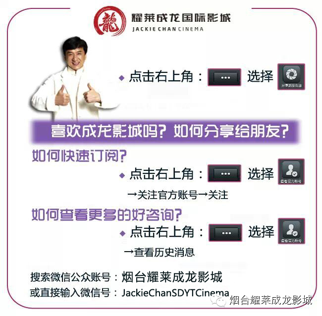 耀莱成龙国际影城是耀莱集团独家拥有的成龙品牌。烟台店为山东省第一家店,成龙影城覆盖了北京、广州、江苏、沈阳、郑州等各大主要城市。影城以五星级的服务理念顶尖的数字放映技、术高端的环声系统及优质的客服服务,为广大烟台市民提供了一个真正星级概念的观影场所。