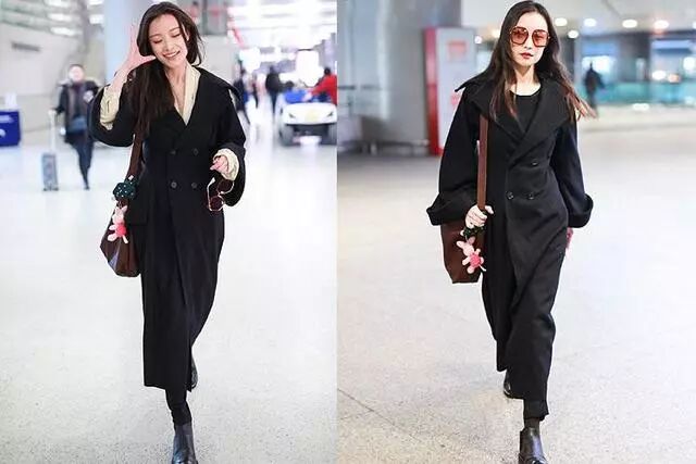 前不久的机场街拍也是,一身黑在她身上就愣生生的穿出女神范,一点也不会觉得呆板沉闷,双排扣的大翻领呢子外套束出妖娆的s曲线,这样单一的色调都难掩她的风情。