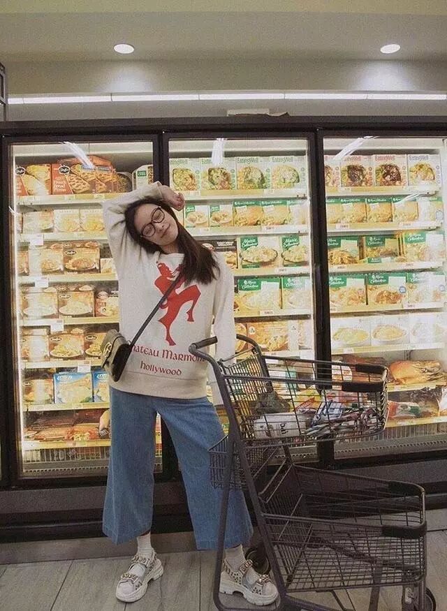 大多数她的风格都是偏宽松的休闲风,直筒阔腿裤大批额白色的印花卫衣,脚上的白色袜子配凉鞋,原本很奇怪的搭配方式穿在她的身上却一点也不违和,这大概就是会穿的人天生具备的能力吧!