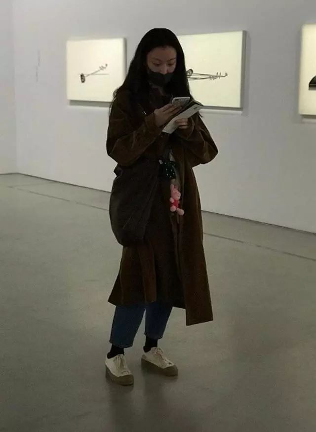 而且她的私服还是那么休闲舒适。棕色灯芯绒长款外套搭着一条直筒略显宽大的牛仔裤,其中脚上的这双神似“解放鞋”的帆布鞋非常惹眼,评论里一溜儿被种草的。