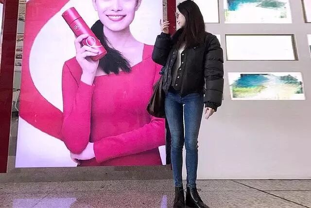 遇到广告牌的自己还不忘合影纪念,穿着肥大的面包款短款羽绒服搭配紧身牛仔裤和马丁靴,整个人干净利落,很显飒爽,身材气质一一尽显。