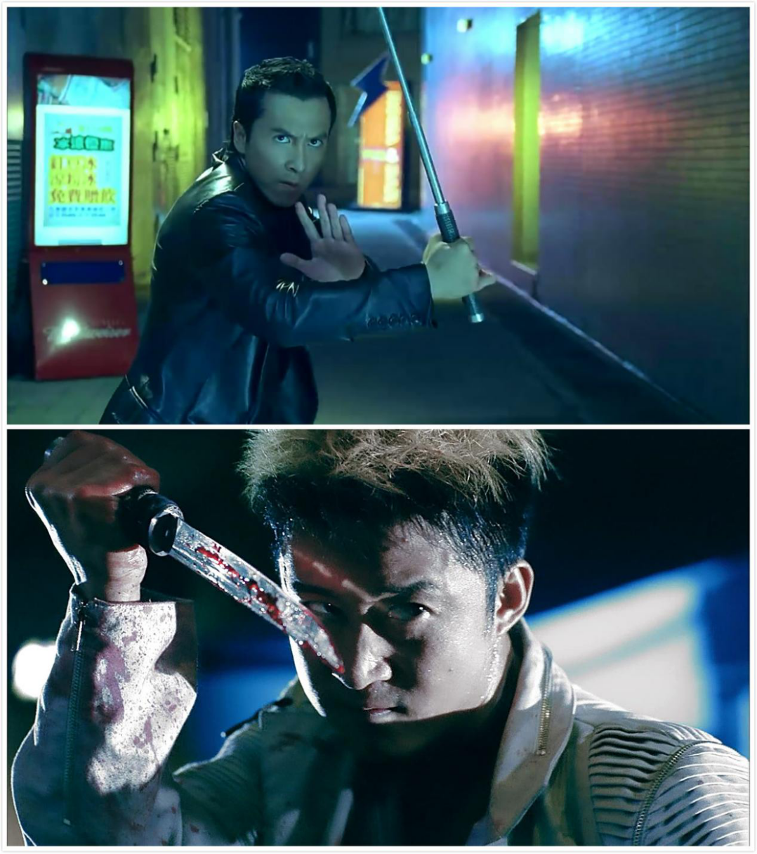 果然,真打起来,场面立刻乱掉。以《杀破狼》为例,由于武士刀和警棍长度相当,可以彼此挥击格挡,便于武术指导设计动作。可蝴蝶刀和警棍却属于完全不同的两个路数,一短一长,前者需要近身,但后者恰恰需要控制距离。前者一近身,后者就无发挥余地,只好丢掉。于是二人扭作一团,徒手王八拳互殴,胡乱抓取周遭物体往对方身上招呼。不仅甄子丹的能力无从展现,动作美感也丧失殆尽。