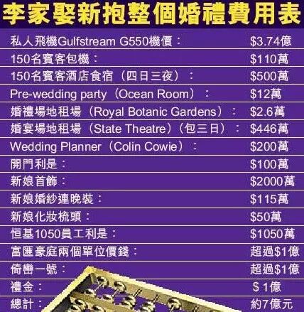 不仅如此,公公李兆基更是花了近3.5亿买下了私人飞机作为新婚礼物。