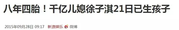 这不今天就看到新闻,说是已经生了两女一男的“千亿媳妇”徐子淇又生啦!据说她在上周一(9月21日)凌晨诞下第四胎。