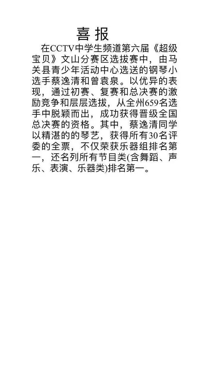 喜报:马关县青少年活动中心选送的蔡逸清和曾袁泉获得第六届<超级宝贝>晋级全国总决赛资格