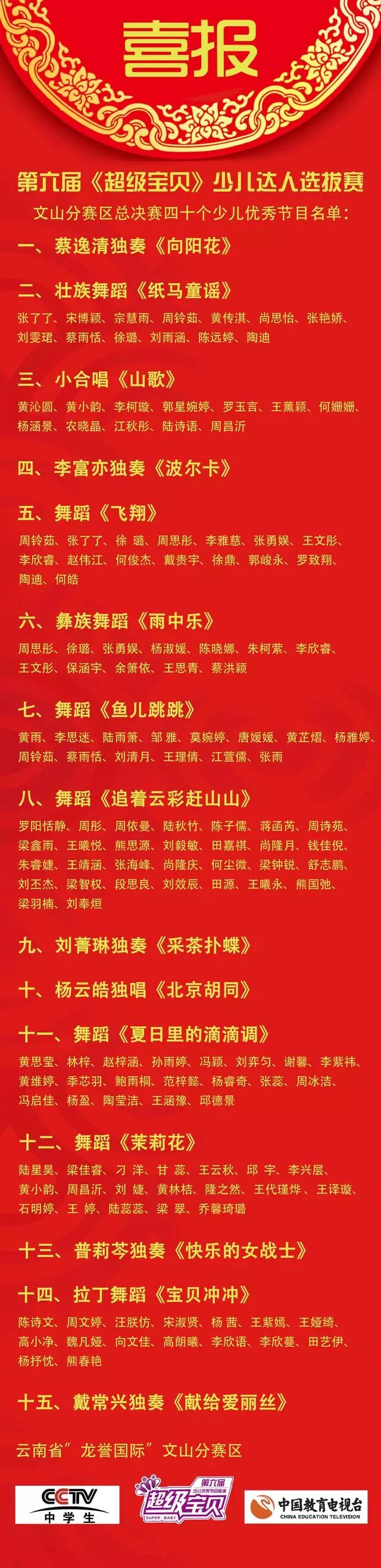 CCTV中学生频道第六届《超级宝贝》文山分赛区优秀节目已选拔完毕,接下来将以视频的形式通过全国组委会的审核,节目审核通过后到文山市广播电视台新画面文化传媒领取通知书,并办理相关手续。具体时间及安排请持续关注《看文山》公众号。