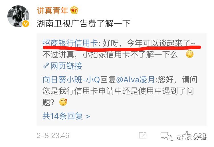 莫名被cue的招×银行官微还转发评论并置顶= = 这一波不要钱的广告砸头上,公关经理躺在家里做梦都能笑醒