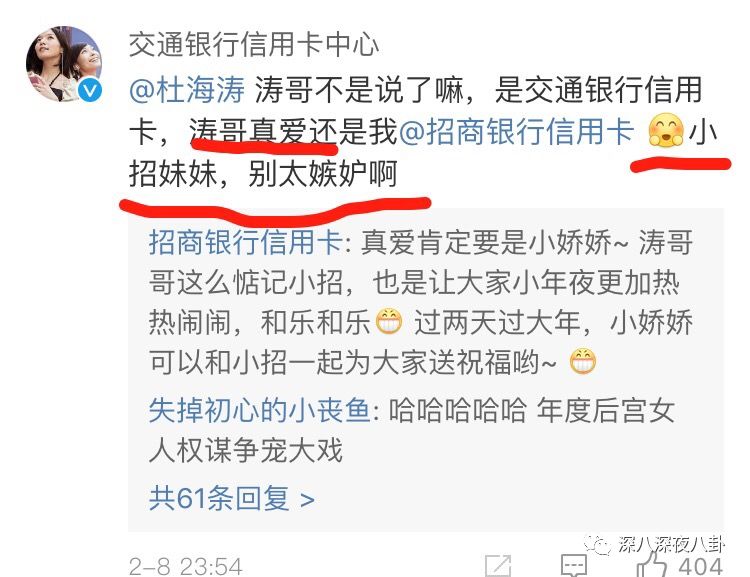 业内好基友说,交行因为上了热搜特别开心,芒果广告部连夜联系上了招行赞助下一场晚会,鹅且招行可能要请杜海涛当代言人了