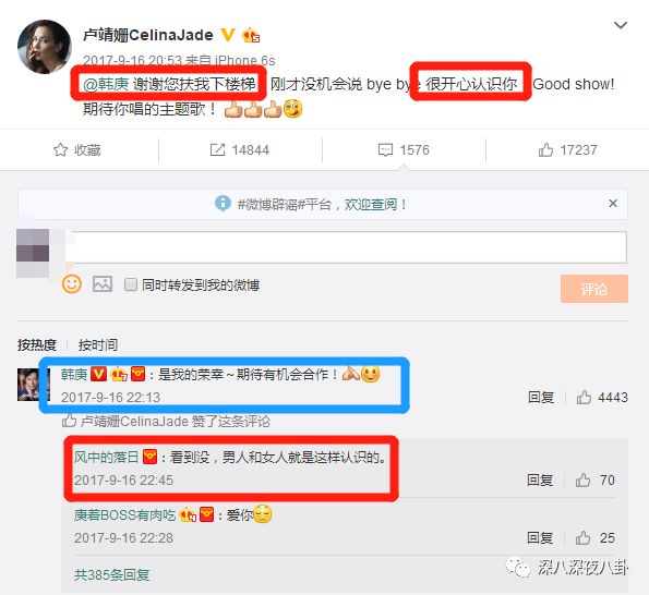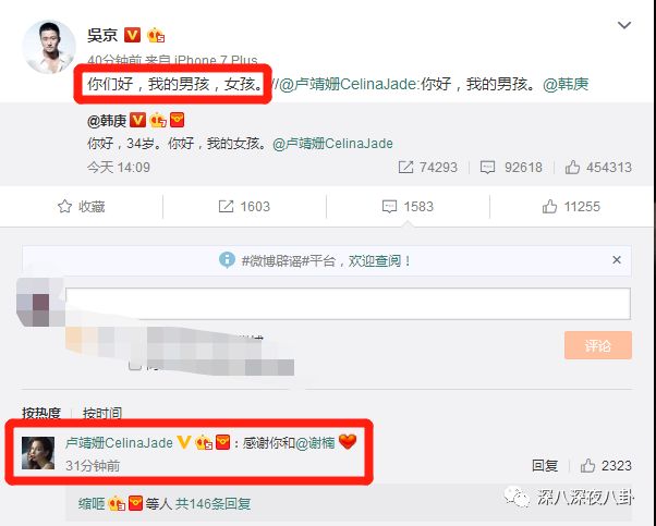 看卢靖姗在吴京转发微博下面的评论,有可能是当时吴京和谢楠看出来妹子对韩庚的欣赏,所以把他俩撮合在一起了诶!!