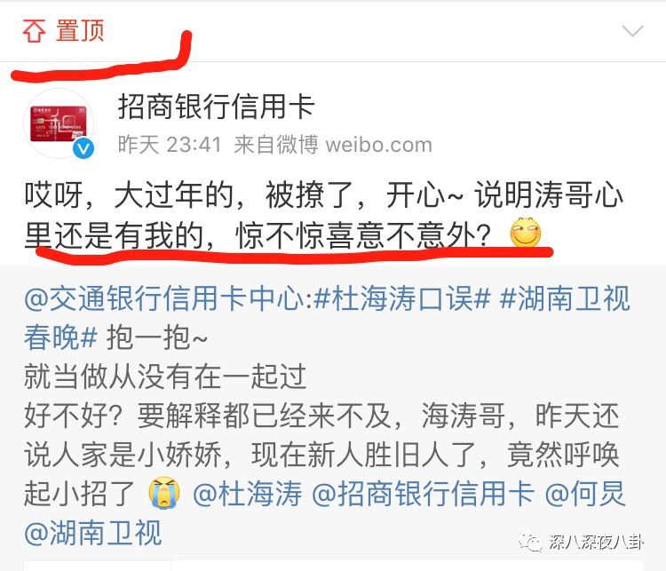 话说回来,交×银行在芒果春晚这么大植入,估计至少大几千万吧。。。昨天就好多人猜测杜海涛会不会因此彻底歇菜