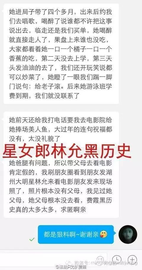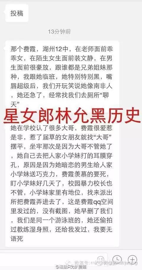 中国几乎每一个一夜成名的明星都会经历被扒各种黑历史的过程,从最早的毛阿敏、赵薇、范冰冰、张柏芝、王凯……突然爆红之外,毕然会让很多人觉得凭什么是她?他?有什么好,昨天还跟我是同桌呢,今天就翻脸不认人了……于是这个湖州12中毕业的原名叫费霞(真的是好土的名字)就被给位老乡扒了个稀巴烂,真是老乡见老乡两眼泪汪汪。另外,林允不光让老乡眼红,她还惹了一群人,那就是林允儿的粉丝。说来达人钧钧也觉得一切都事出有因,你说费霞你起什么名字不好?为什么人家叫林允儿,你非要叫林允啊,难怪林允儿的粉丝也加入了黑林允的大军,黑料简直触目惊心……往下看吧: