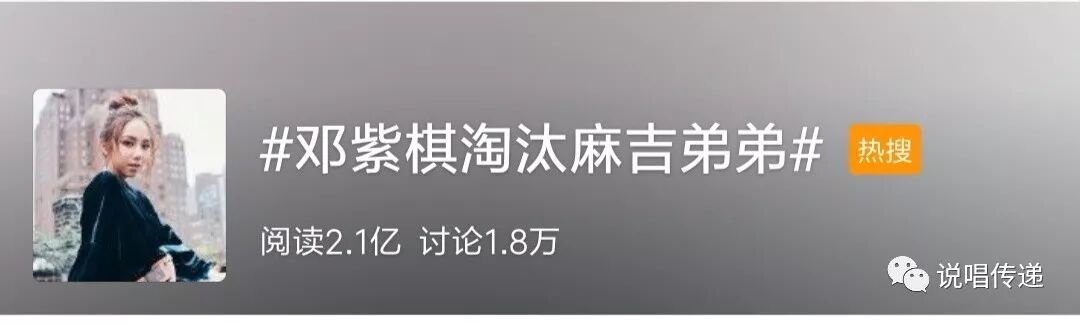 “麻吉弟弟被邓紫棋淘汰”在微博上有2.1亿的阅读,1.8万讨论,还上了当天的热搜。