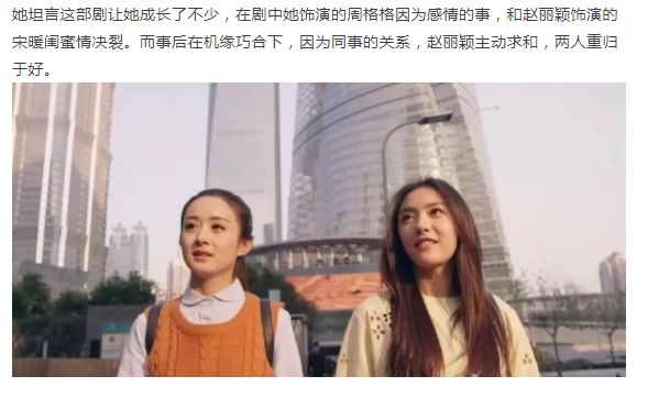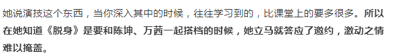 她坦言每天在片场中,谈论的最多的就是戏,今天这场戏好不好,那场戏该怎么演,就连吃饭的时候都不放过,真的是很敬业和认真,这也让她收获颇丰。