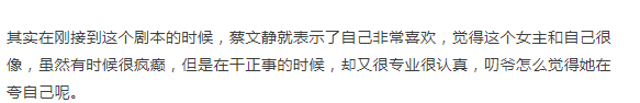 蔡文静说自己不算有天赋的演员,但是却又一腔热血,拍摄时经常凌晨在收工,或者有时候会因为拍摄没有吃饭,但是她不但不觉得累,反而乐在其中。