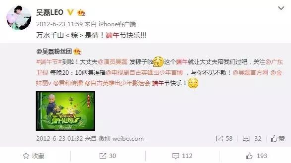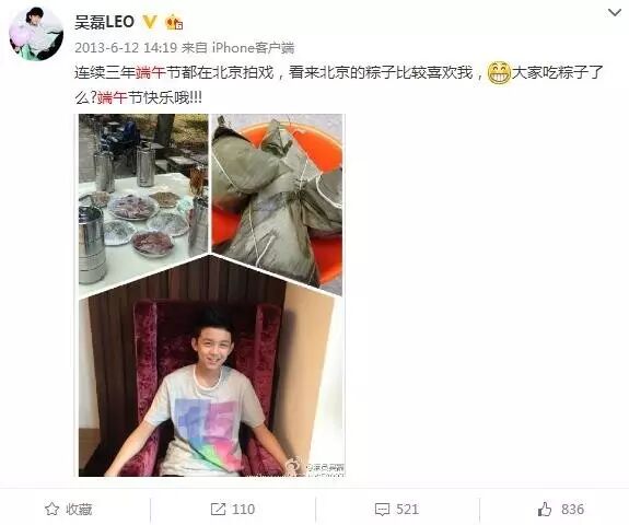 2013年:“连续三年端午节都在北京拍戏,看来北京的粽子比较喜欢我,大家吃粽子了么?端午节快乐哦!!!“