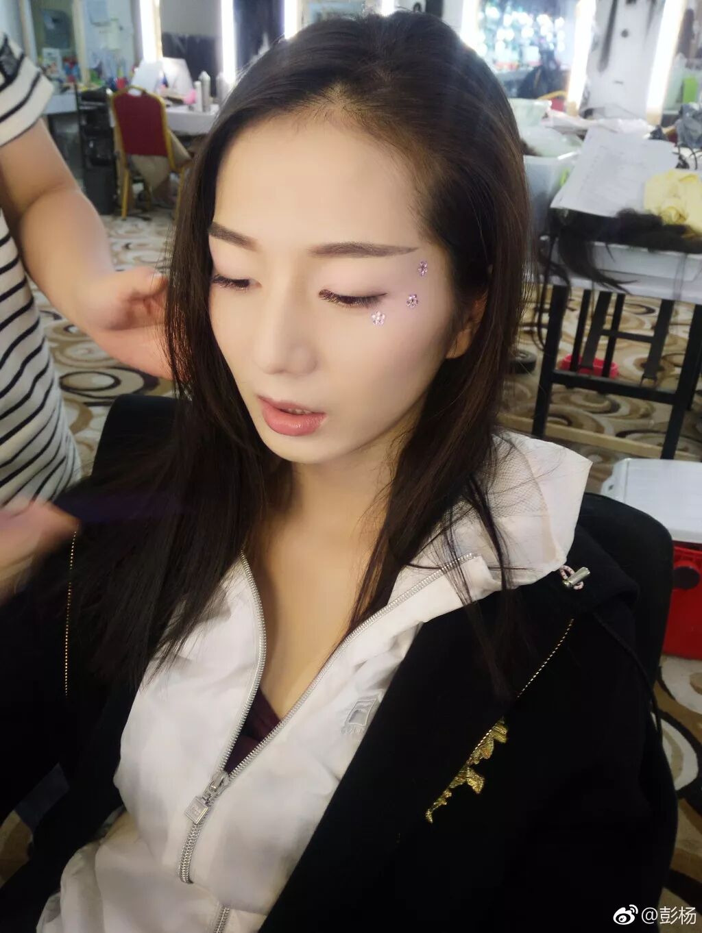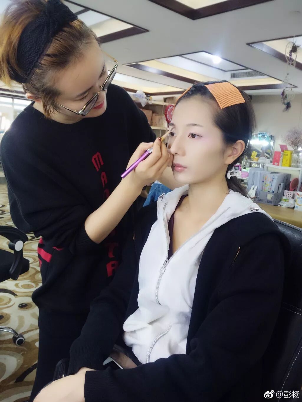 在彭杨晒出的工作照里,有两张是正在化妆的长芳主。