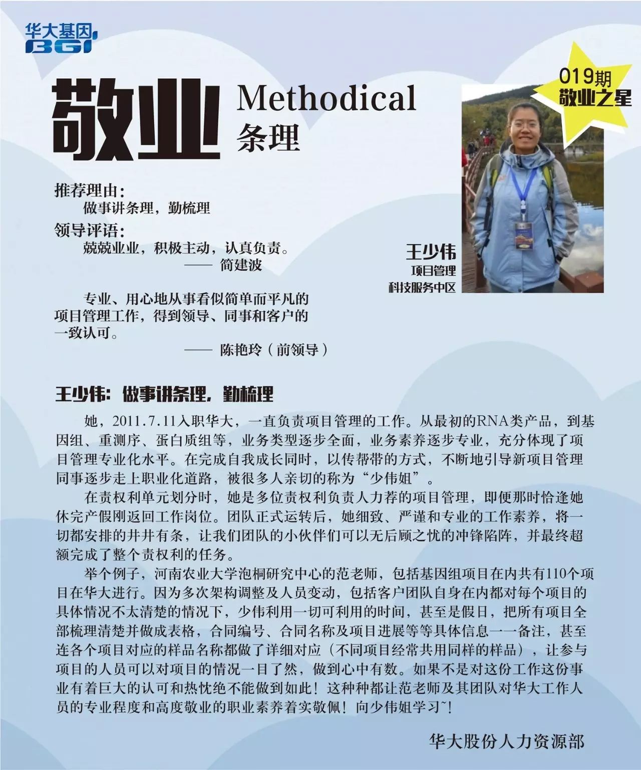 她,2011.7.11入职华大,一直负责项目管理的工作。从最初的RNA类产品,到基因组、重测序、蛋白质组等,业务类型逐步全面,业务素养逐步专业,充分体现了项目管理专业化水平。在完成自我成长同时,以传帮带的方式,不断地引导新项目管理同事逐步走上职业化道路,被很多人亲切的称为“少伟姐”。
