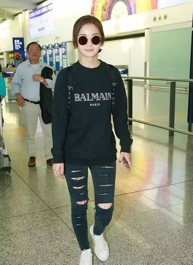 机场里的蔡卓妍,一条破洞牛仔裤,吸引大家要求,看起来破洞不堪,却流露出时尚感,搭配黑色圆领卫衣,为时尚加分。