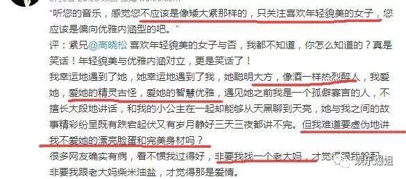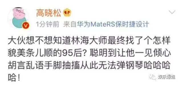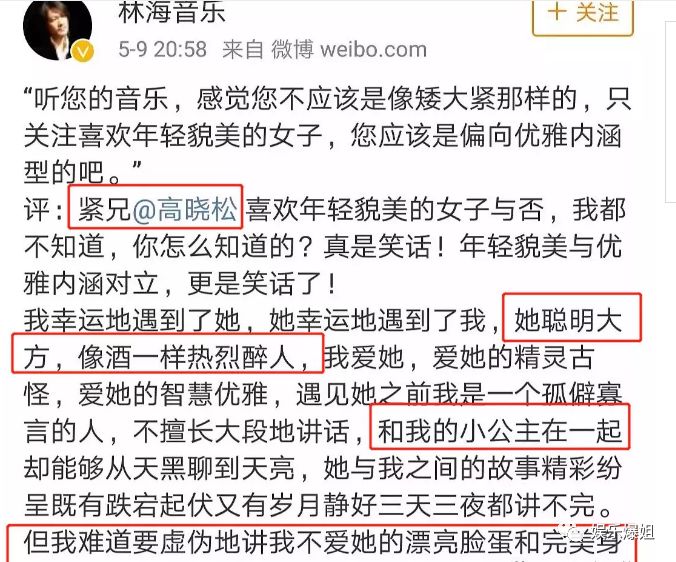 隔了10小时之后,反应过来的林海再发长文,表示与95后小女友情比金坚。还把高脱下水,意思就是在网友心里,高是那种喜欢年轻貌美的,而他则喜欢优雅内涵的。对高晓松的态度也一百八十度大转弯:“晓松兄”变成“紧兄、矮大紧”。