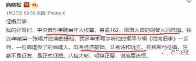 原来,一月份的时候高晓松帮自己的好哥们林海发了一条微博征婚。