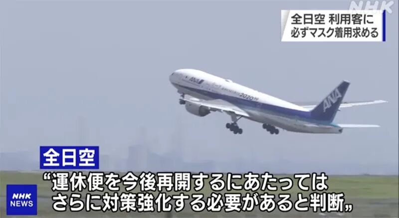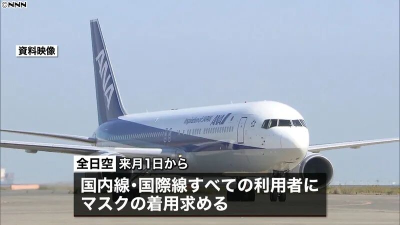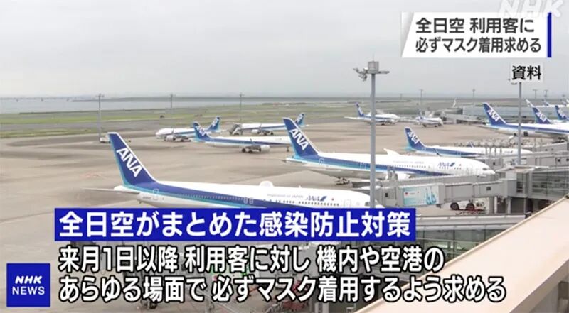 日本全日空公司发布的防疫对策中,要求自6月1日起所有搭乘该公司航班的乘客,在候机楼、安检区域及机舱内等各乘机环节均需佩戴口罩。