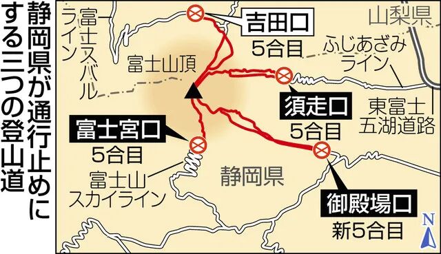 富士山登山可以选择从山梨县或者静冈县出发,选择山梨县吉田路线的登山客占总数的约6成,而静冈县也于16日决定在今夏封锁富士宫、须走、御殿场三条登山通道,将在近期正式公布。