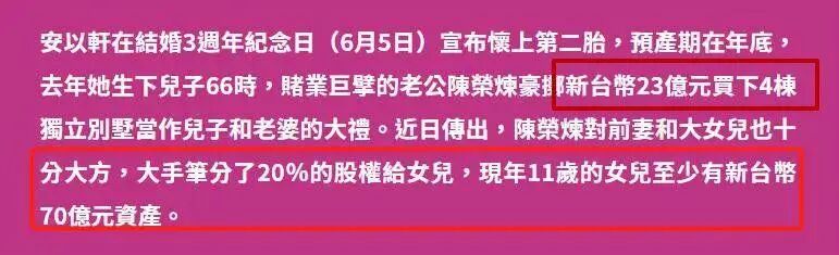 而陈荣炼对安以轩在物质上的奖励更是令人咋舌。先不说从恋爱到婚后期间各种节日送的上千万珠宝钻石,安以轩生下大儿子66的时候就获赠了价值24亿新台币,约5.5亿人民币的豪宅。