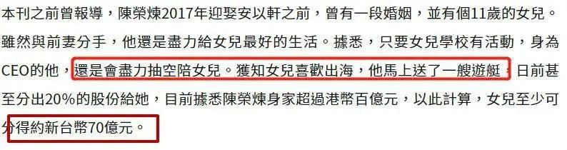 近日,有媒体报道安以轩的百亿丈夫陈荣炼送了价值70亿新台币,也就是18亿多的公司股权给自己的前妻和11岁的女儿。