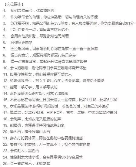 随后骚恩打开唯品会的官网,发现唯品会正在招聘“惊喜助理”一职,该岗位居然罗列出了100条招聘要求!!认真看下来,我去,这不周董的歌词吗,难道给小公举招助理了?赶紧看图,你符合要求吗?
