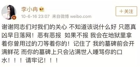 随后,李小冉直接在微博上与疑似黑社会的凶手发起对话,一句“我会在地狱里拿着你曾用过的刀等你”,刚烈无比。