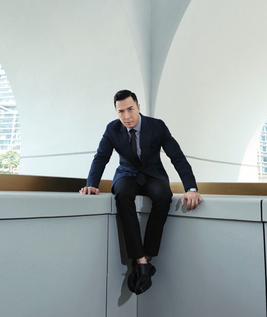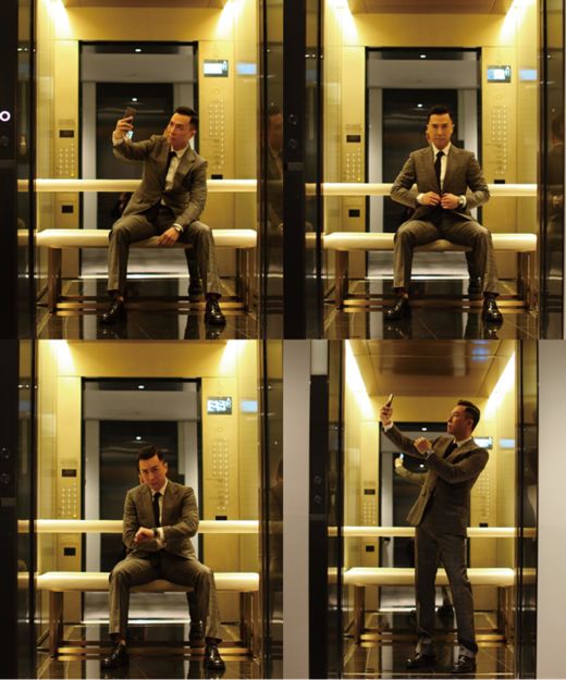这样说,好像在镜头中的甄子丹很有“主见”(就像他的电影一样,充满”甄子丹风格”), 但其实他对情境设定十足配合—拍电梯内“自拍”场景之时,甄子丹拿着 iPhone 就直接上场,自拍表情丰富、趣味十足,而他也会“自增桥段”, 时而皱眉、时而微笑,感觉就是个正装打扮的男子,在电梯中展现自己的时尚魅力—事后我们打开手机相簿,发现他不是做做样子而已,而是真的“自拍”,而且看他拍照角度与画面构图,自拍技术似乎也相当“老道”;另一个在车道的场景,摄影师请他坐上围墙,拍摄有“自在悠游”感的形象, 他双手一撑轻松跃上,率性风格就在此一跃中跃然展现—不过我们的动态摄影师因反应不及(“你要随时准备好呀!”甄子丹笑说),请他”再来一次”, 他自在地跃下又重新跃上(这次还带了点花式), 成功之余还对着摄影机双手比了胜利手势,那一刻, 甄子丹心中的小孩子在镜头中偷偷跑出,向大家展示他那具赤子之心的一面。