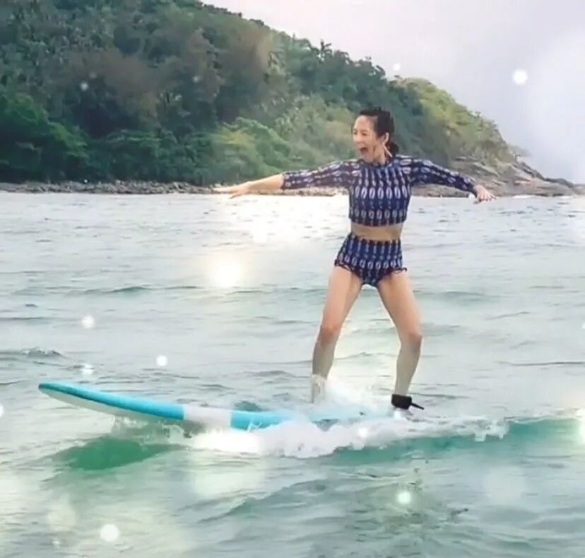 这次可以看到她是在海上冲浪,而且她身上只穿着一套套装,选择的颜色是比较暗沉的,并且可以看到她下面的那一双腿,就这样展现在大家的面前,感觉她的身材其实一直以来看起来都是比较瘦的那一种。