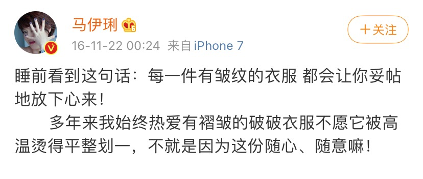 她发过一条微博,似乎委婉地回应了这件事:「每一件有皱纹的衣服,都会让你妥帖地放下心来!」