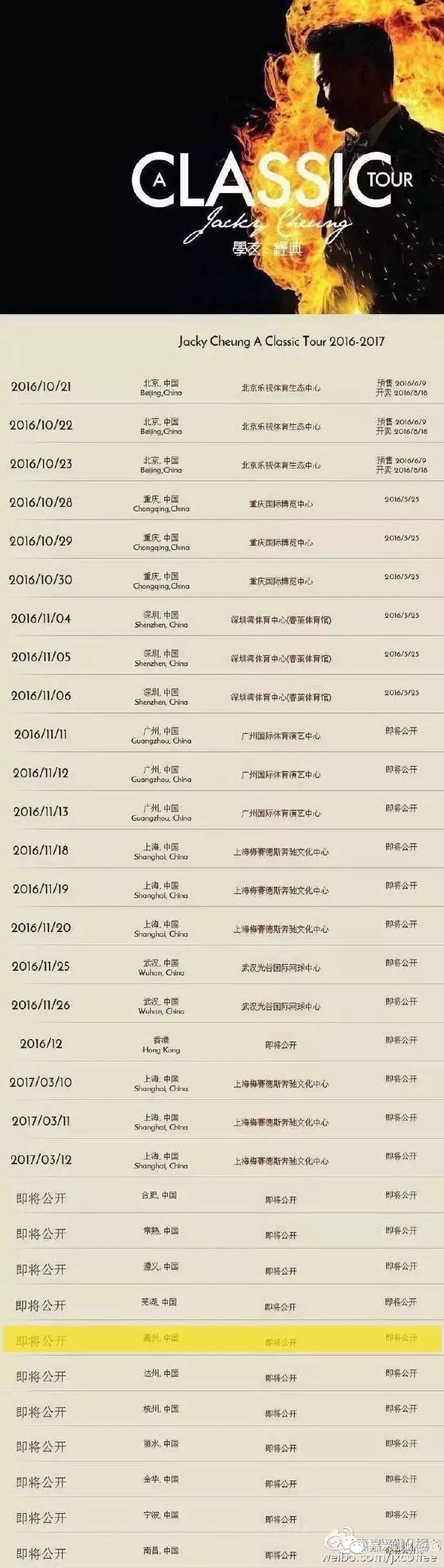 周杰伦来了,张学友也要来! 5月18日,张学友在北京瑰丽酒店召开新闻发布会,宣布2016 A CLASSIC TOUR 世界巡回演唱会正式启动。看了长长的巡演城市清单,突然发现歌神也要来嘉兴开演唱会了!嘉兴站的具体时间请留意微博或大麦网更新!来源:嘉兴演出网