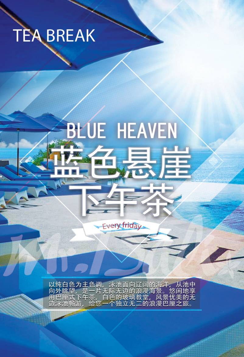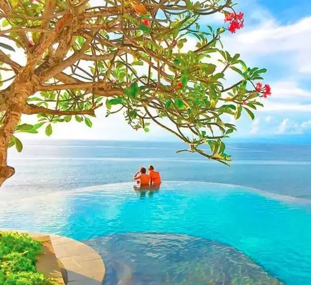 【蓝色悬崖下午茶】在这里可以在风景优美的无边泳池畅游!泳池旁边的餐厅向游客提供下午茶的服务,在这里悠闲地享用巴厘式下午茶,观赏白色教堂,与最爱的她观赏窗外海天一线的美景,许诺一生。