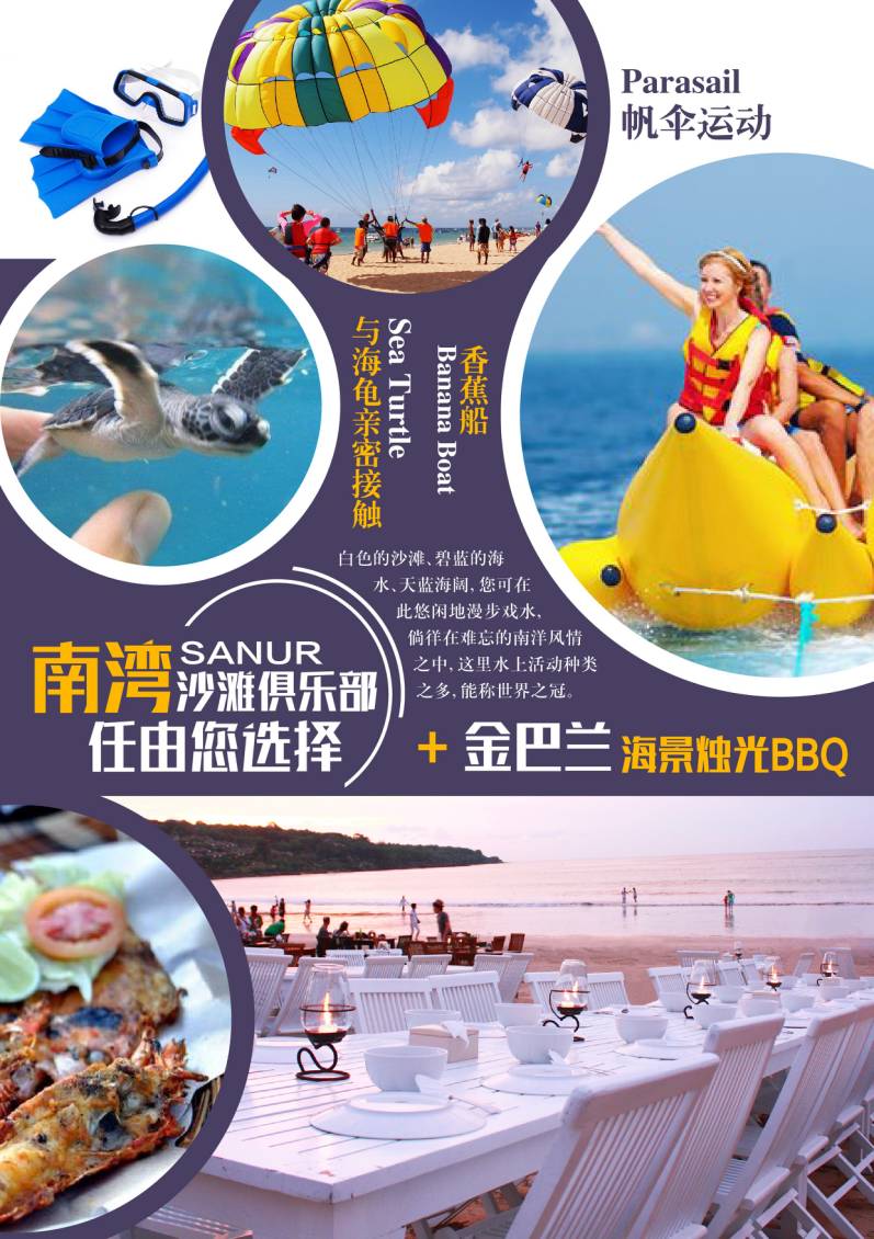 【南湾沙滩俱乐部】南湾位于巴厘岛最南端,是水上活动的主要区域。在这里可以游客可以个人爱好自费选择参加拖曳伞、水上摩托车等活动。