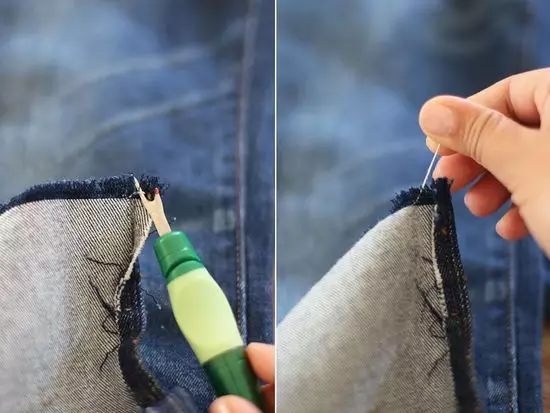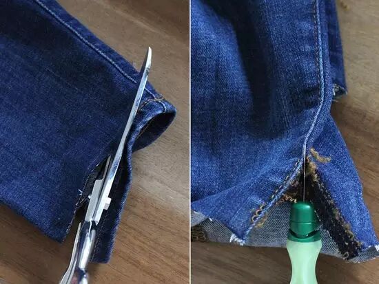 先用剪刀把车缝的裤脚剪掉,