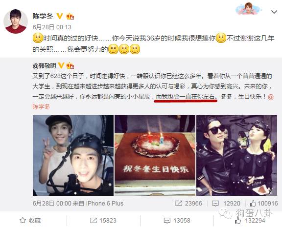 而半个月前6月6是小四的生日,陈学冬特意在6时6分6秒给小四发祝福,表示不离不弃,6得飞起。小四则恨铁不成钢地回复:小兔崽子翅膀硬了......