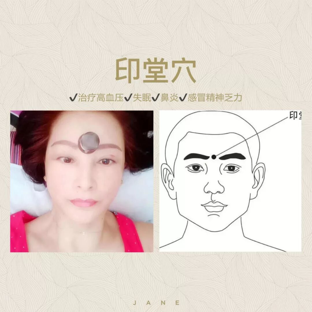 印堂穴在两眉头的中间;有明目通鼻、宁心安神的作用。印堂是一个人精气神聚集的地方,灸后可以快速地疏通气血,让面部恢复光泽;有延缓衰老、驻颜回春的作用。更重要的是女性随时都会遇到生活上的心烦事,灸灸这里可以有豁然开朗,宁心安神的作用。