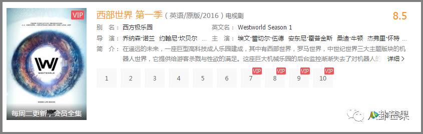 同是HBO制作的被称为神剧的《西部世界》也在腾讯视频独家更新了,会员可以看全集,赶快撸起,感受一下科技带来的恐惧感