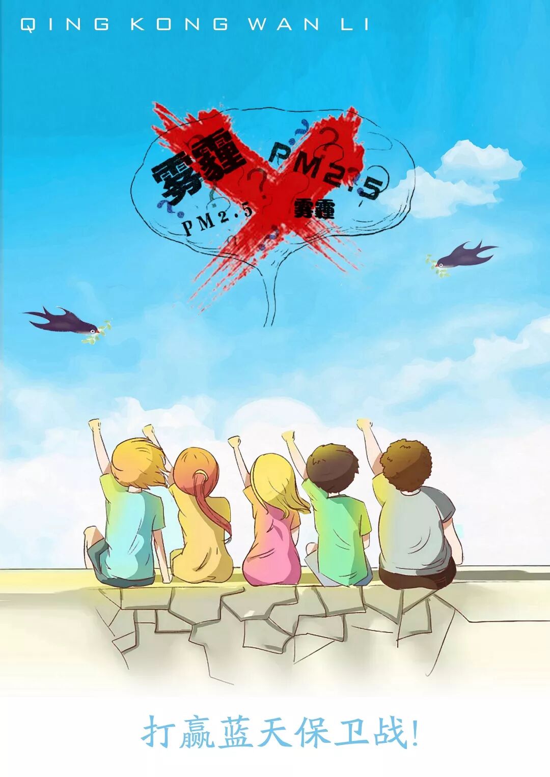 设计理念:在最近几年国家大力的整治下,“APEC蓝”已成为一二线城市的“日常操作”,一句响亮的打赢蓝天保卫战口号已成为公众的共识,但在此背景下,依然存在着不少不合理、不协调的发展状况,这幅作品重点突出这句口号对于代表着祖国未来的青少年,用他们的动作来表明国家在治理污染,保卫蓝天的决心。