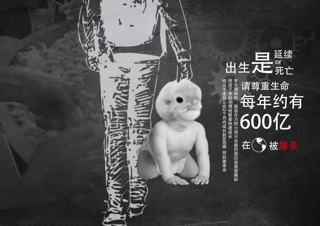 第二张广告主体为一个长着小鸡头的婴儿,婴儿作要爬走状,然而却要被一个无情的人拽走,等待它的是绞肉机冰冷的刀。背景中养鸡场的“筛选”场景若隐若现,刚出生的小鸡就像婴儿一样,然而等待它们的却是被粉碎抛弃或是疯狂长肉等待被“屠杀”。图中右半部分将这一血淋淋的事实文字化,出生是要延续还是死亡?也许当你新出生的婴儿出生的时候,也会要面临这个问题,但是我们只想让你知道,选择不是屠杀,希望你对生命保持尊重。