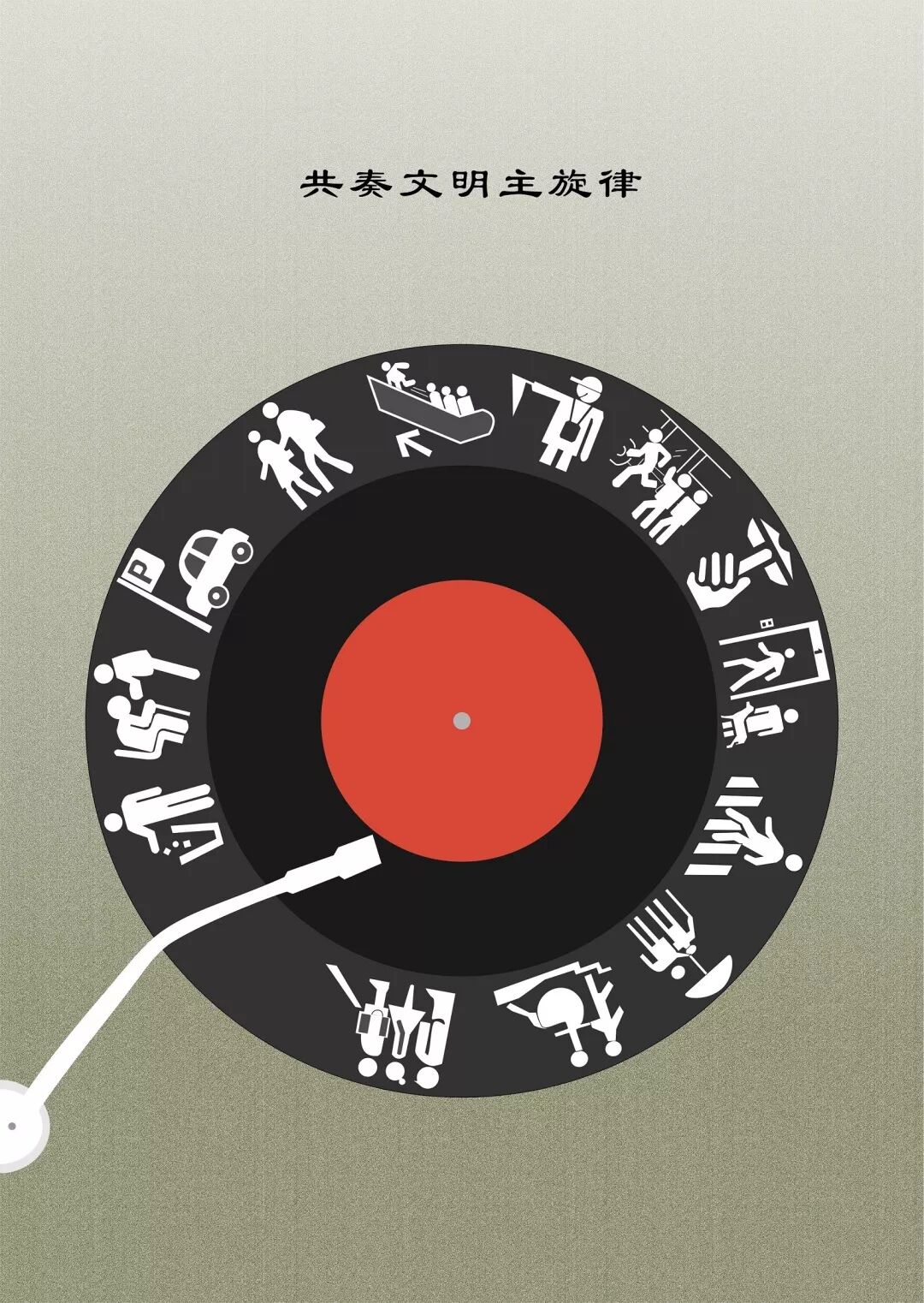 设计理念:本作品以留声机的形式,将新时代文明旋律的抽象概念融入到客观存在的视觉表达中,以更直观的方式表达共奏文明主旋律的主题。图一主体用各种文明行为的标识,通过图像的简单表达,表现了奏响文明旋律就是从身边的每件小事做起,形象的体现了作品主题。图二主体为各种不同字体的不同文明语言,以文字的形式呼吁大家传达文明,践行文明。整体图文结合给人以充分的想象空间。