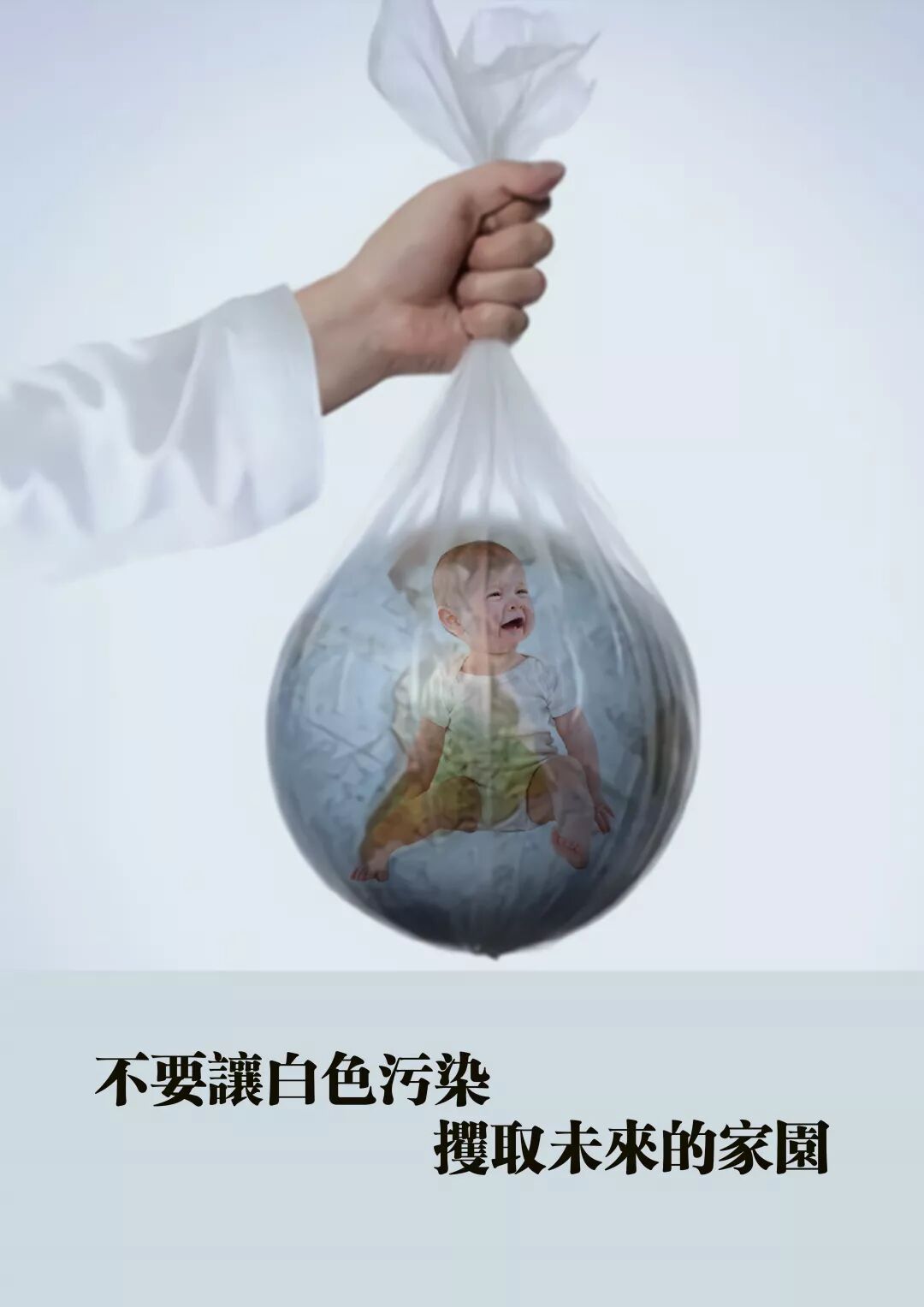 设计理念:我国是世界上十大塑料制品生产和消费国之一。在各种公共场所到处都能看见大量废弃的塑料制品,他们从自然界而来,由人类制造,最终归结于大自然时却不易被自然所消纳,从而影响了大自然的生态环境。这幅作品以被塑料袋包围的地球和啼哭的婴儿做为设计主体极具震撼力,呼吁大家减少塑料制品的使用。