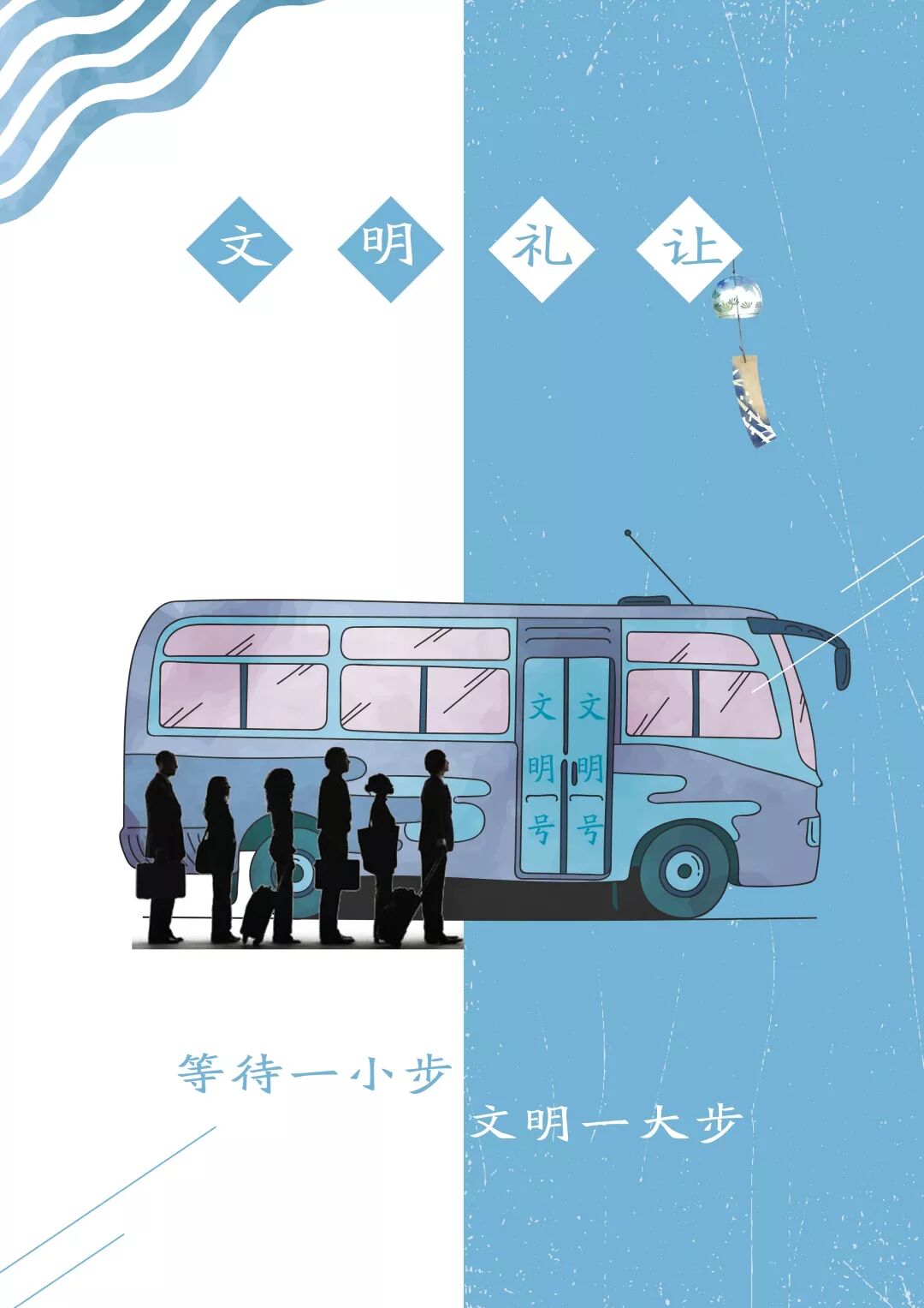 设计理念:礼让是美德更是文明,中国素有“文明古国,礼仪之邦”的美称,弘扬中华民族传统美德,应该从我做起,从身边做起,文明出行,礼让行人,上下公交不拥挤。正如这幅作品所示:“等待一小步,文明一大步。”这样“文明号”才能跑的更远更舒心。同时画面采用白蓝撞色设计,更具青春感。