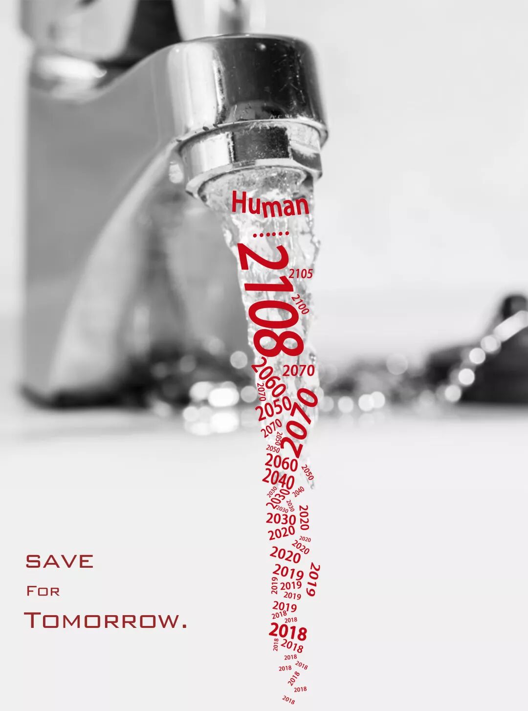 因此在海报中,把每一滴水象形化成一个年份,刚开始适度使用的是属于今天的资源,过度挥霍的则是明天的能源,流走的数字代表了我们的未来,希望以此唤醒人们的环保意识和觉知。