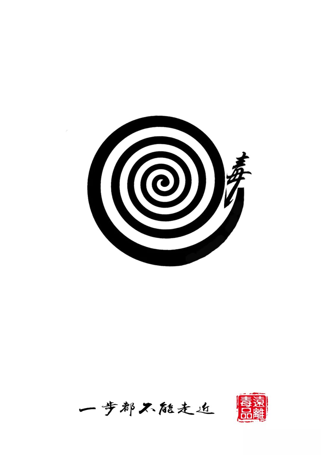 作品“禁毒”,主要元素是一个毒字和漩涡,表达的是一旦接触毒品,就会如同掉入漩涡,只会越陷越深,无法自拔。
