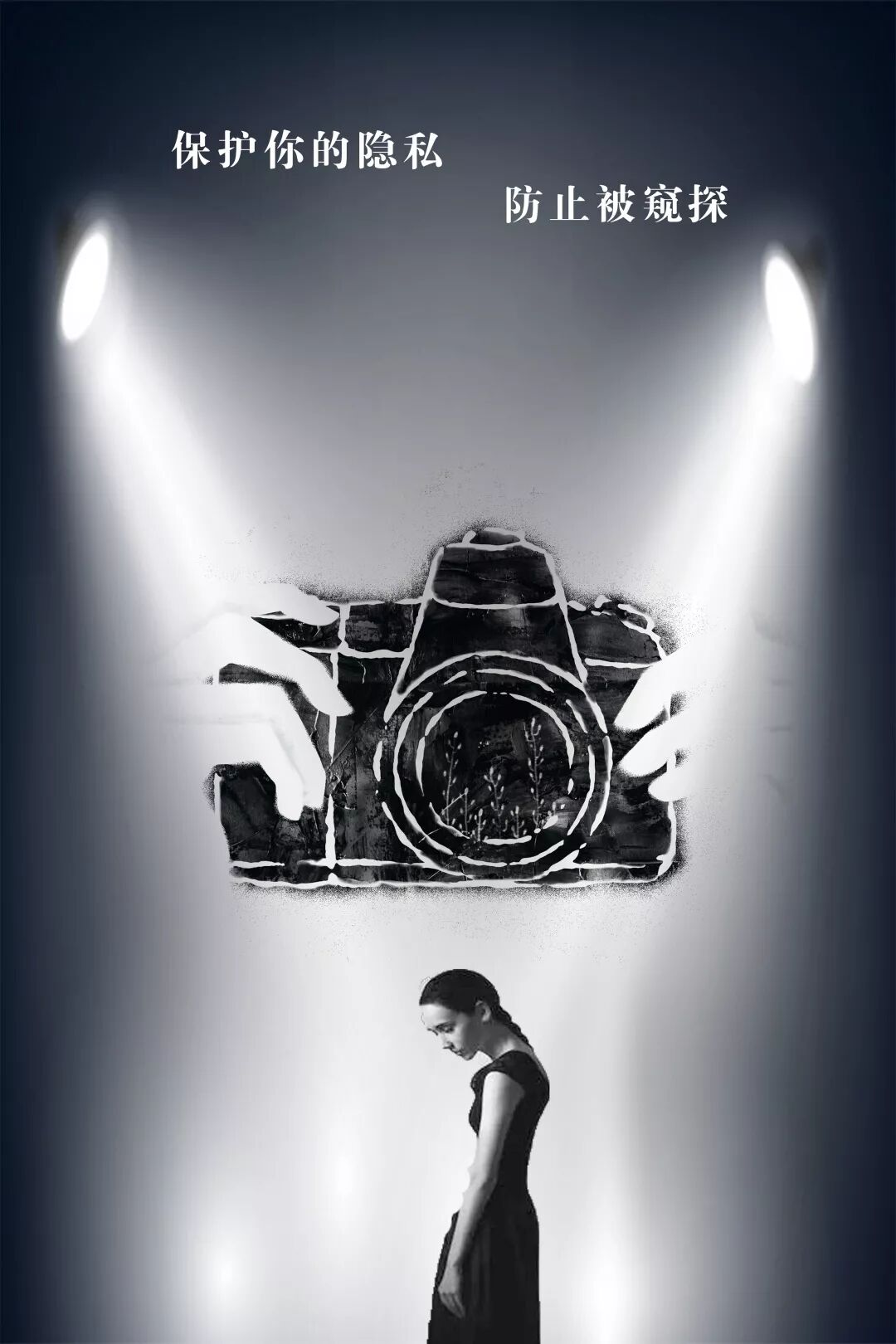 设计理念:近几年,公众的隐私保护意识逐渐提高。然而随着互联网应用的不断深入,不知不觉中隐私泄露变的如此容易。本幅作品着眼于聚光灯时代更应注重自我隐私保护的理念,以聚光灯、相机、人像作为设计素材,同时高级灰的选用更增强画面质感。
