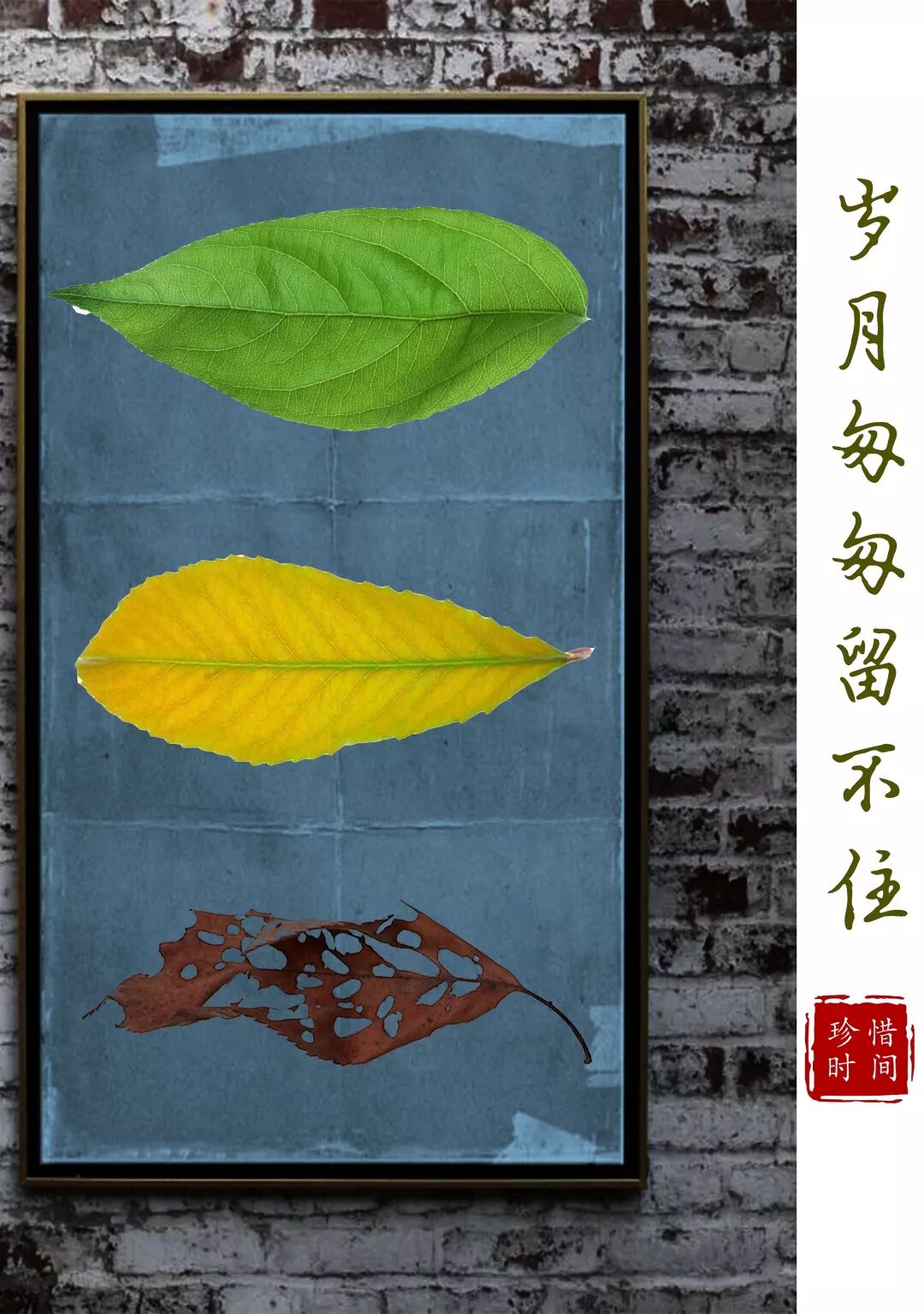 设计理念:珍惜时间是一个永恒的话题,三片树叶恰似人的一生,由青变黄,由盛转衰,生命何其短暂。生老病死人之常情,本幅作品采用绘画作品的形式,希望通过画框里“叶子的一生”表达时间飞逝珍惜时间之意。